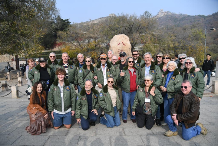 10月29日,飞虎队老兵莫耶一行人在北京八达岭长城合影留念。当日,美中航空遗产基金会访华代表团成员陆续抵达北京。新华社记者任超摄