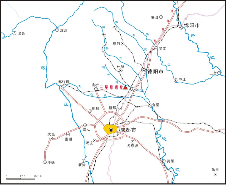 三星堆古城的营建参考了自然山川走势,与成都平原的整体走向一致为东北——西南向。古城与河流关系尤为密切,甚至有马牧河穿城而过,一方面便于生产生活取水用水,另一方面又便于利用水路对外联系,体现出先进的城市营建思想。