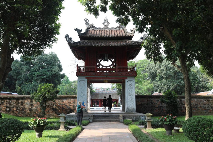 身穿古装的中国游客和身穿越南传统服饰奥黛的越南青年在文庙门前合影。