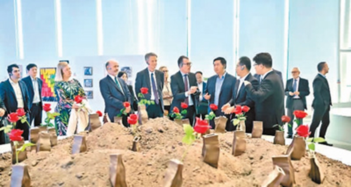 外国驻华使节和外交官在深圳南山能源生态园内的科普教育基地参观艺术作品《岩石里的花》。庄国威摄