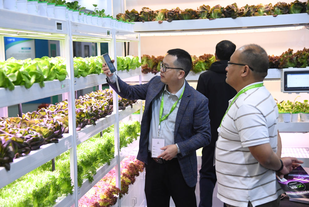 2023世界农业科技创新大会11月2日至4日在北京举行。这是2023年11月2日,工作人员(左)在世界农业科技博览会现场介绍智慧植物工厂。新华社记者 任超 摄