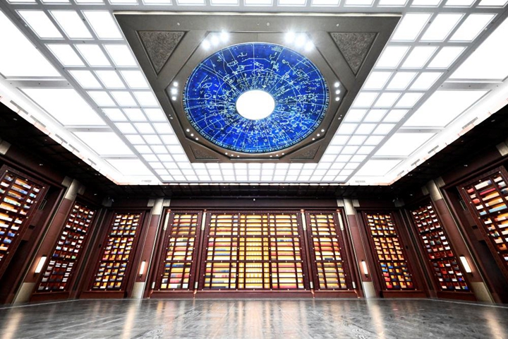 △中国国家版本馆中央总馆“文瀚阁”内景。星空穹顶上是一幅宋代石刻天文图,传递着“文瀚阁”的寓意:中华文明如星空般浩瀚璀璨。