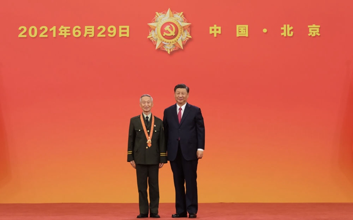 2021年6月29日,习近平总书记向“七一勋章”获得者崔道植颁授勋章。新华社记者 李学仁 摄