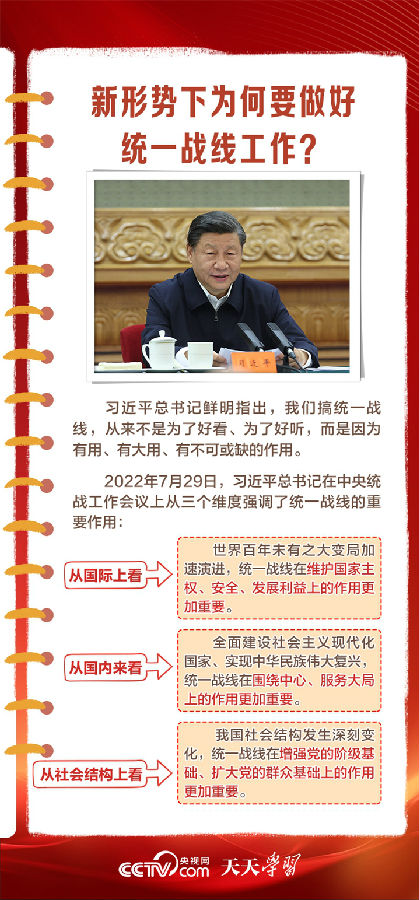 在百余年的奋斗历程中,我们党始终把统一战线摆在重要位置,让团结的旋律始终高昂,共同奋斗的力量始终激荡。从“重要法宝”到“强大法宝”,体现出总书记对党的统战工作一以贯之的高度重视。