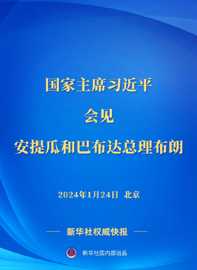 1月24日下午,国家主席习近平在人民大会堂会见来华进行正式访问的安提瓜和巴布达总理布朗。