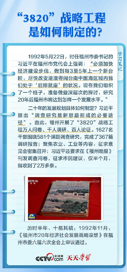 天天学习 上世纪90年代,习近平在福州工作期间,亲自主持编制了《福州市20年经济社会发展战略设想》(简称“3820”战略工程),系统谋划了福州3年、8年、20年经济社会发展的目标、步骤、布局、重点等,为福州擘画了美好蓝图,确立了总纲领、总方略。