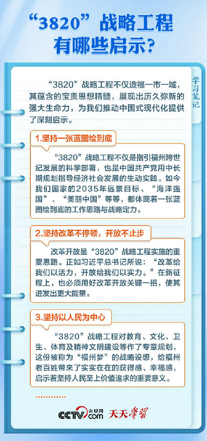三十多年来,福州坚持“3820”战略工程思想精髓不动摇,一张蓝图绘到底,不断开创现代化国际城市建设的崭新局面。“3820”战略是如何制定的?其思想精髓和时代价值有哪些?央视网《天天学习》栏目与您一起学习领悟。
