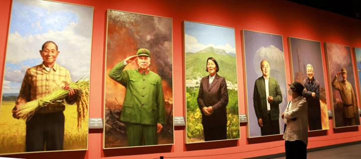 2022年10月1日,观众在“筑梦——我们的新时代美术摄影作品展”上观看油画《“共和国勋章”获得者》。新华社记者 潘旭 摄