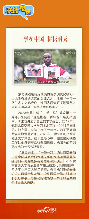联播+ 日前,北京交通大学肯尼亚留学生及校友代表致信习近平主席,表示非常高兴来到中国学习铁路运营管理知识。1月17日,习近平主席复信表达欣慰和喜悦之情,“蒙内铁路是中肯共建‘一带一路’旗舰项目和成功典范。我高兴地看到,你们因这条‘幸福路’与中国结缘……”