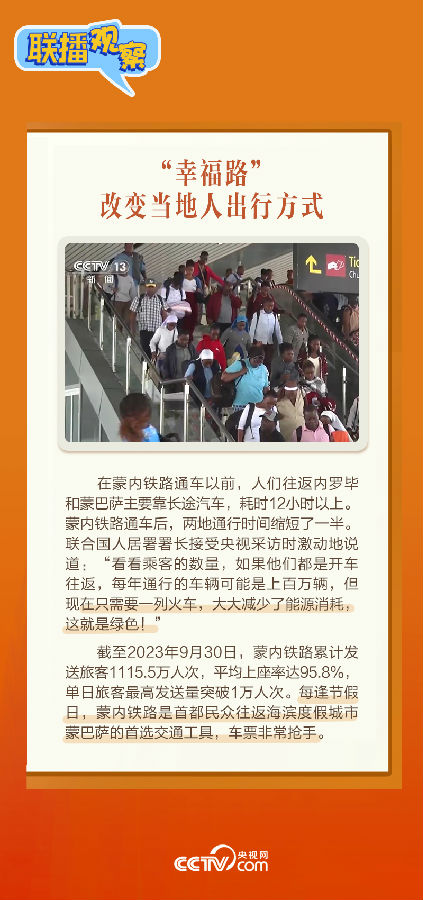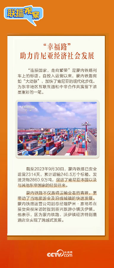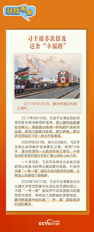 此前,习主席在外事活动中多次提及蒙内铁路,《新闻联播》也持续关注这条路的建设及开通后的运营情况。这条“幸福路”有何特别之处,习主席为何频频提及?它的建成通车给当地带来哪些变化?《联播观察》邀您一同了解。