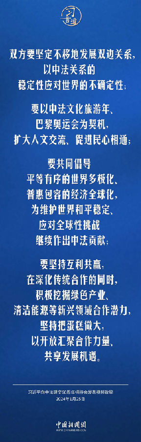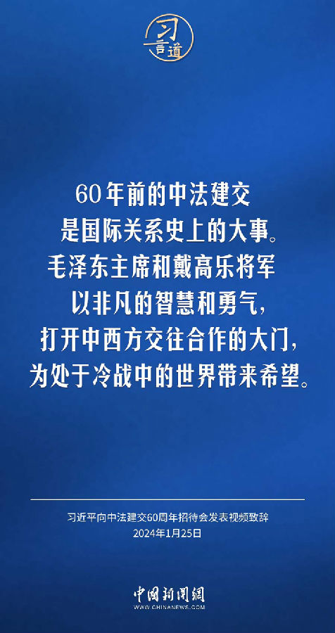 1月25日,中法建交60周年招待会在国家大剧院举行,国家主席习近平发表视频致辞。习近平指出——