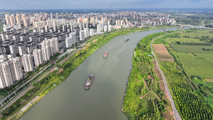 △ 2023年8月21日,安徽阜阳,初秋时节,界首城市建设与沙颍河水系、桥梁和绿植相映衬,构成一幅生态宜居的美丽画卷。