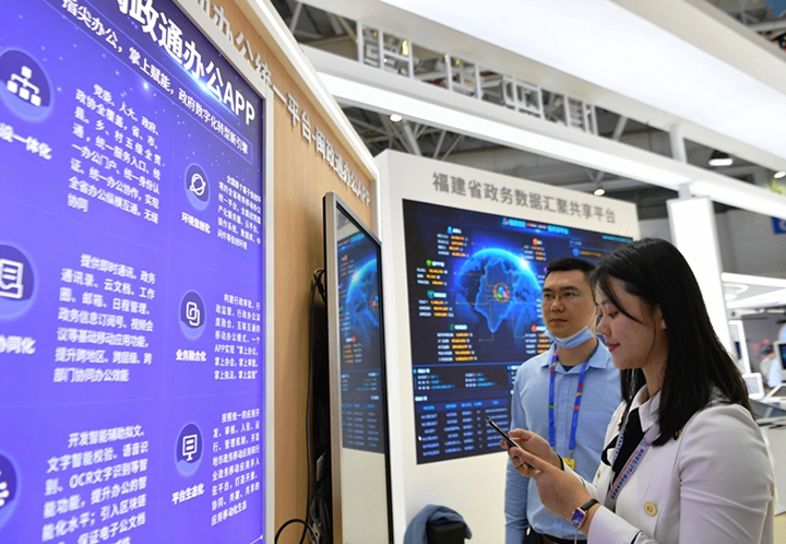 2021年4月25日,在第四届数字中国建设峰会数字成果展览会上,观众在参观福建省政务数据汇聚共享平台展示的闽政通APP。
