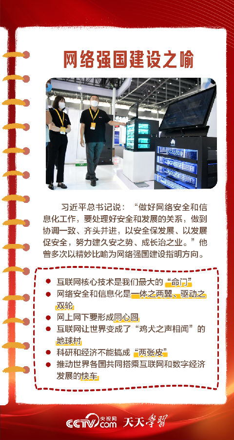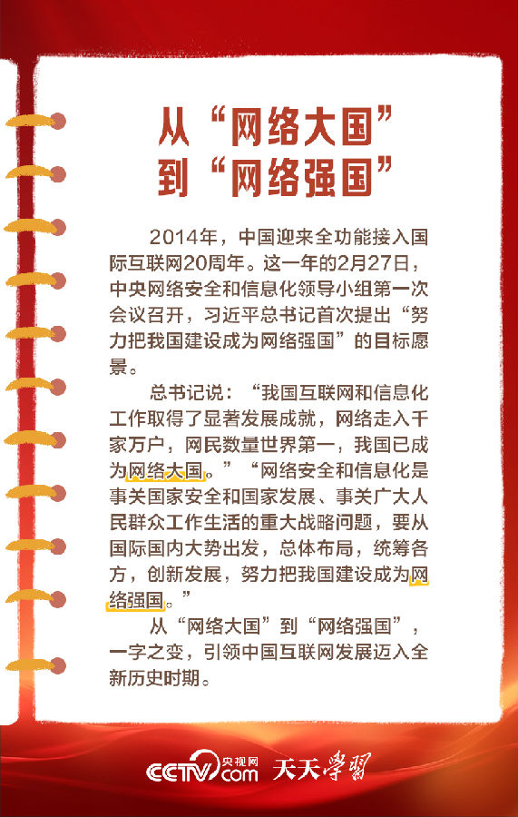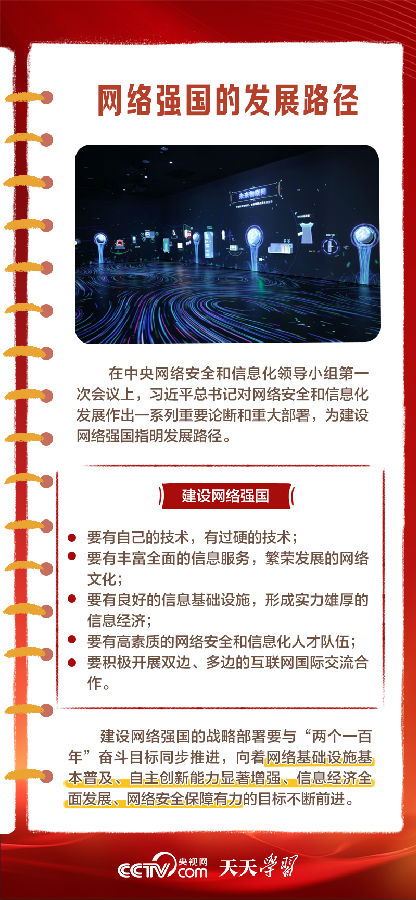 天天学习 党的十八大以来,习近平总书记高度重视网络强国建设,在网络强国建设实践基础上,提出了一系列新思想、新观点、新论断,形成了关于网络强国的重要思想。在这一重要思想引领下,我国互联网发展进入全新时代,网络强国蓝图徐徐铺展。