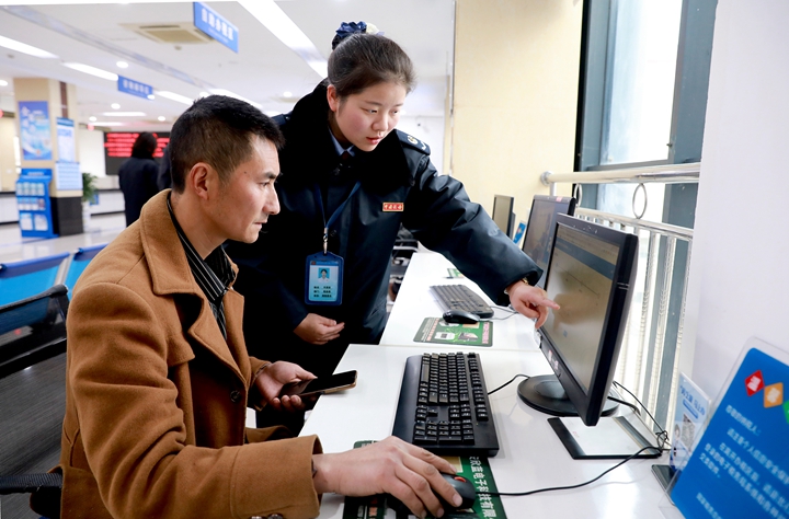 △ 2023年12月12日,四川省华蓥市政务服务大厅,税务局流动岗位工作人员向群众介绍网上自助办理税务事项。