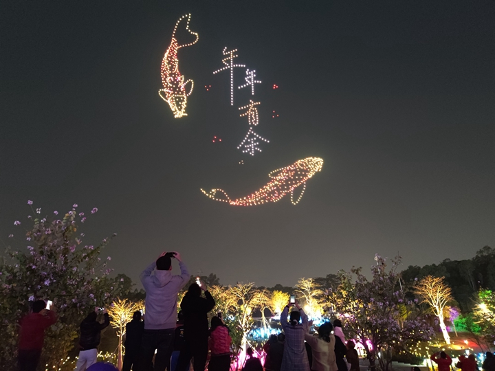 △ 2024年2月10日,深圳北站中心公园,春节主题无人机灯光秀引来众多游客驻足观看。