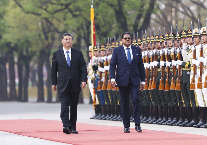 4月12日下午,国家主席习近平在北京人民大会堂同来华进行国事访问的苏里南总统单多吉举行会谈。这是会谈前,习近平在人民大会堂东门外广场为单多吉举行欢迎仪式。新华社记者 申宏 摄