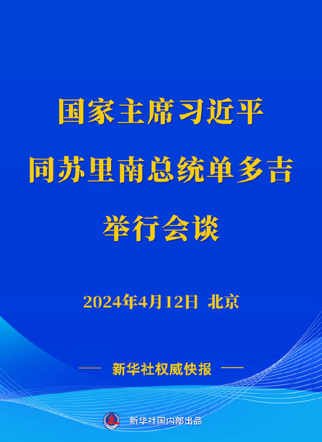 新华社北京4月12日电(记者刘华)4月12日下午,国家主席习近平在北京人民大会堂同来华进行国事访问的苏里南总统单多吉举行会谈。