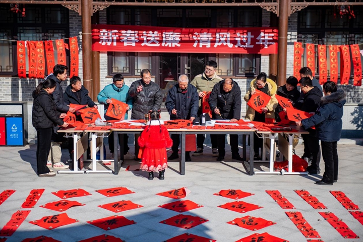 △2024年1月25日,河南省漯河市源汇区纪委监委组织离退休干部在问十乡陶桥村为群众义写廉洁春联。