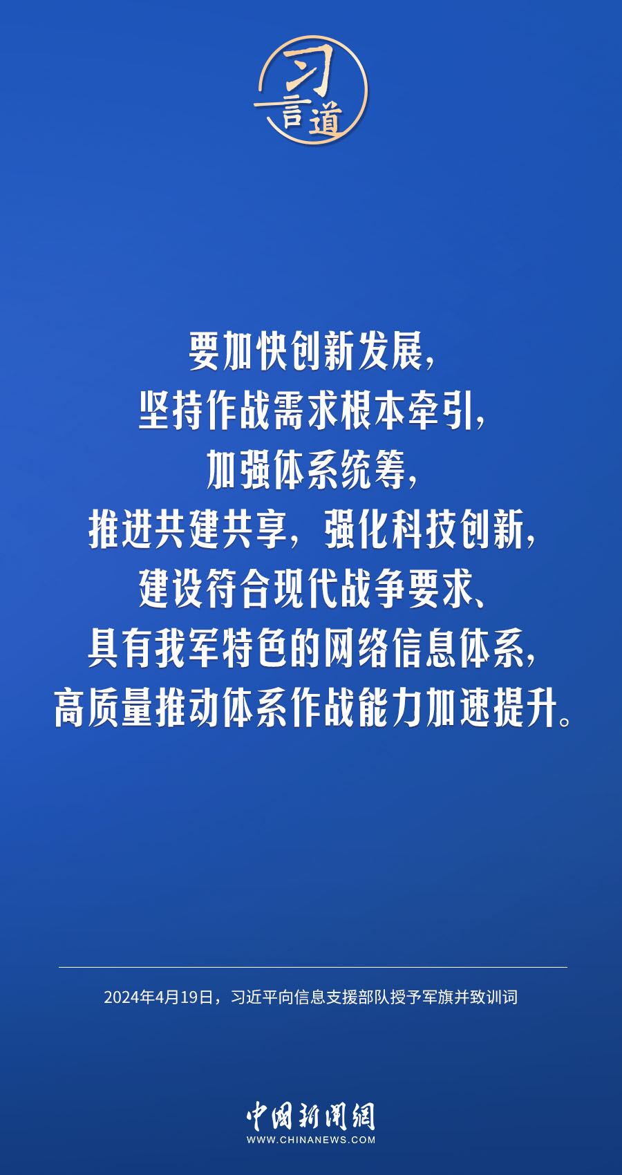 中国人民解放军信息支援部队成立大会19日在北京八一大楼隆重举行。中共中央总书记、国家主席、中央军委主席习近平向信息支援部队授予军旗并致训词,代表党中央和中央军委向信息支援部队全体官兵致以热烈祝贺。他强调——