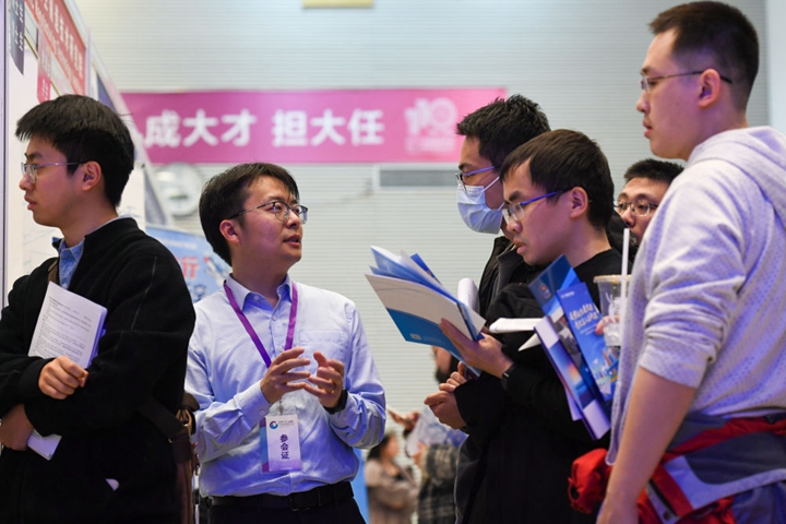 在清华大学举办的2024届毕业生大型就业洽谈会上,一名用人单位招聘人员(左二)与求职毕业生交流(2024年3月15日摄)。新华社记者 鞠焕宗 摄