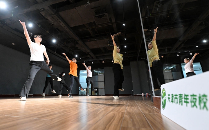 在天津青年宫,学员在青年夜校练习有氧健身舞(2024年4月23日摄)。新华社记者 赵子硕 摄