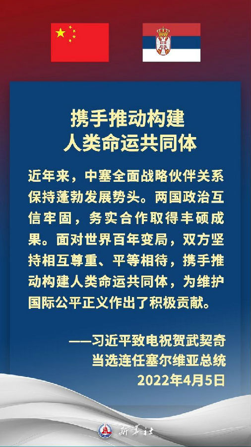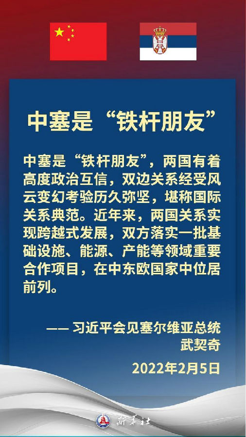 塞尔维亚是中国在中东欧地区首个全面战略伙伴。近年来,在习近平主席和武契奇总统战略引领下,中塞关系保持高水平运行,双方坚定支持彼此核心利益和重大关切,两国政治互信牢固,高质量共建“一带一路”取得丰硕成果,在多边领域协调紧密。习近平主席多次在重要场合提及,中国和塞尔维亚是“铁杆朋友”。