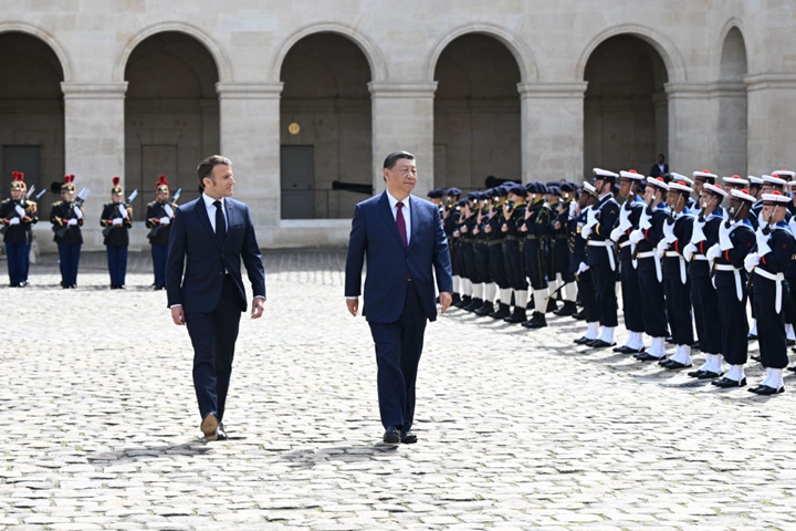 习近平和夫人彭丽媛乘车抵达时,马克龙和夫人布丽吉特在下车处热情迎接。在雄壮的进行曲中,两国元首步入广场。军乐团奏中法两国国歌。两国元首检阅法兰西共和国卫队和陆海空三军仪仗队,并观看分列式。随后,习近平和彭丽媛同法方主要官员一一握手致意。马克龙夫妇同中方陪同人员分别握手致意。