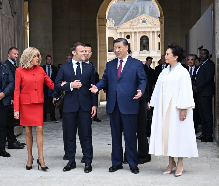 五月的巴黎,风和景明。塞纳河畔,荣军院金色穹顶熠熠生辉,五星红旗和蓝白红三色旗迎风飘扬。