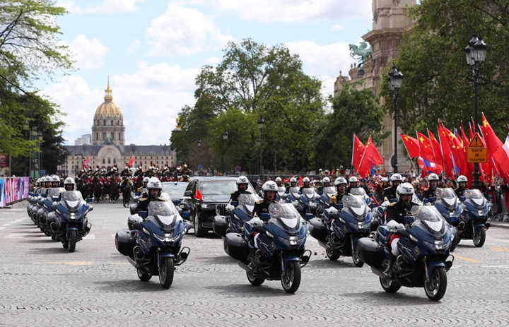 欢迎仪式后,习近平和彭丽媛在共和国卫队148名骑兵组成的礼兵马队和摩托车队护卫下,乘车前往爱丽舍宫。