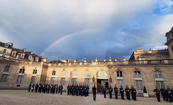当地时间5月6日晚,习近平主席在巴黎出席马克龙总统举行的盛大欢迎宴会。宴会前,爱丽舍宫上空出现彩虹。彩虹连接着东西方。塞纳河畔,正写下中法两国“双向奔赴”的新故事。
