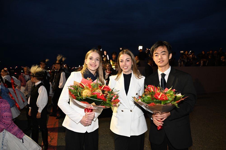△当地时间5月8日晚,在匈牙利布达佩斯国际机场,匈牙利姑娘欧拉·塔玛拉(中)与匈中双语学校两名参加欢迎仪式的学生合影。