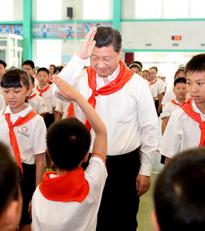 2014年“六一”国际儿童节前夕,“大朋友”习近平成为北京市海淀区民族小学一年级少先队入队仪式的见证者,他亲手为一年级八班的王彦尊系上了红领巾。