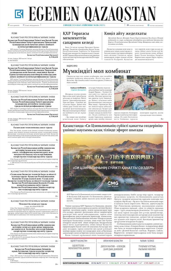 在中国国家主席习近平出席上海合作组织成员国元首理事会第二十四次会议并对哈萨克斯坦进行国事访问之际,由中国中央广播电视总台制作的《平“语”近人——习近平喜欢的典故》第三季(哈萨克语版),将于当地时间7月2日起在哈萨克斯坦落地播出。当地多家主流媒体对节目落播进行预告,引发哈萨克斯坦各界普遍期待和广泛关注。