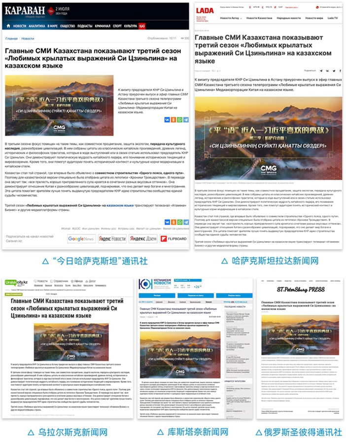 7月2日,哈萨克斯坦政府机关报、最有影响力的报纸《哈萨克斯坦真理报》(俄语版),《主权哈萨克斯坦报》均在头版刊发节目在哈落地播出的预告消息。文章指出,节目展现了中华民族自古以来开放包容、兼收并蓄的文化胸怀,阐释中国历来主张尊重世界文明多样性,并致力于推动不同文明间的和谐共生,为包括哈萨克斯坦在内的共建“一带一路”国家受众提供了了解习近平主席提出的构建人类命运共同体理念的思想路径。