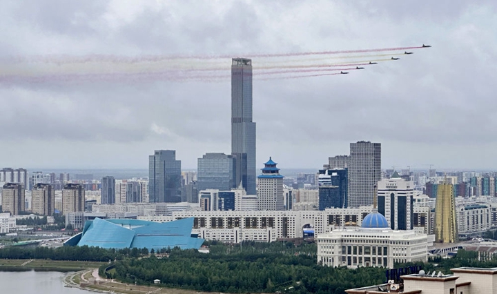 当地时间3日,国家主席习近平在阿斯塔纳出席哈萨克斯坦总统托卡耶夫举行的欢迎仪式。