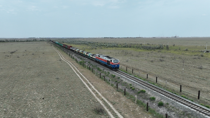 △ 2023年5月12日,在哈萨克斯坦阿拉木图附近,货运列车驰骋于阿拉木图与中国霍尔果斯间(无人机照片)。