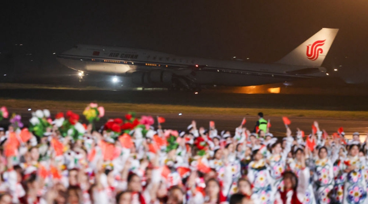 拉赫蒙在机场为习近平举行盛大隆重的迎宾仪式。1500多名身着民族盛装的塔吉克斯坦青年表演富有浓郁特色的中塔歌舞,挥舞中塔两国国旗,表达对中国最尊贵客人的热烈欢迎。