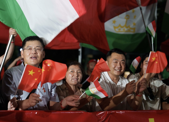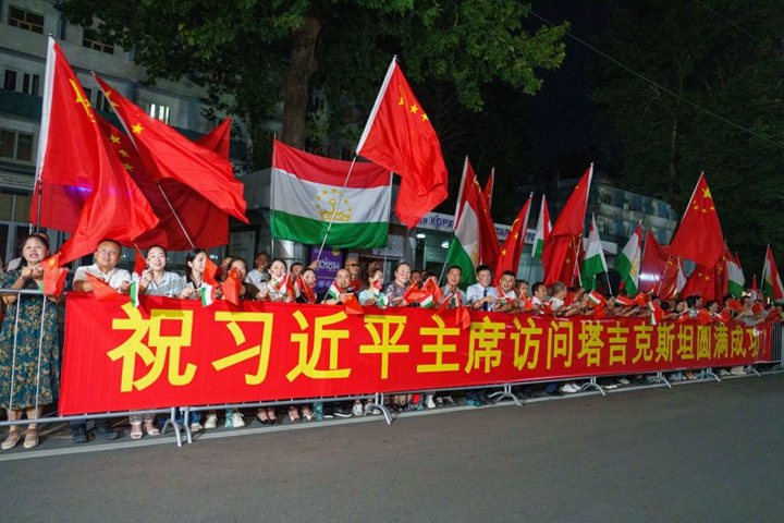 习近平乘车从机场赴下榻饭店途中,中塔两国国旗迎风飘扬,当地华侨华人和中资机构代表列队挥舞中塔两国国旗,热烈欢迎习近平访问塔吉克斯坦。