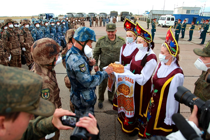 当地时间2021年9月10日,跨境参加“和平使命-2021”上海合作组织成员国联合反恐军演的中方部队导演部抵达俄罗斯奥伦堡“东古兹”靶场演习地域。图为俄方人员为中方人员举行欢迎仪式。