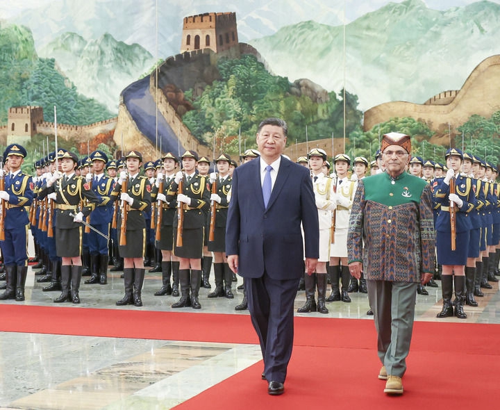 7月29日上午,国家主席习近平在北京人民大会堂同来华进行国事访问的东帝汶总统奥尔塔举行会谈。这是会谈前,习近平在人民大会堂北大厅为奥尔塔举行欢迎仪式。新华社记者 刘卫兵 摄