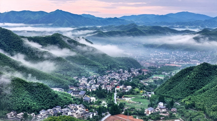6月24日,骤雨初歇,安吉县天荒坪镇余村,飘逸的云朵在竹海上升腾,民居与青山层叠相拥,构成一幅美丽的生态画卷。2.jpg