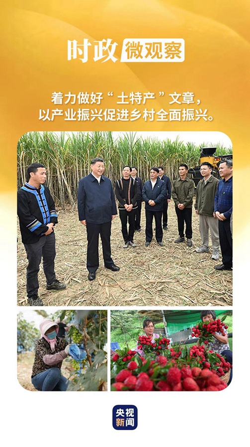 习近平总书记强调,要着力做好“土特产”文章,以产业振兴促进乡村全面振兴。在地方考察时,他多次来到大棚里、田埂上、果树间、农舍前,为特色产业谋思路、为农民致富找门路。