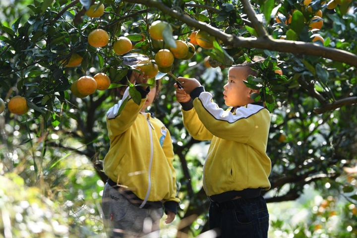 △贵州黄平县小朋友在校外劳动实践基地采摘柑橘。