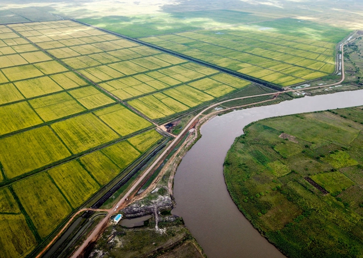 这是莫桑比克万宝莫桑农业园的水稻田(2019年4月7日摄,无人机照片)。万宝莫桑农业园是中非合作的大型水稻种植项目,极大地缓解了莫桑比克粮食短缺问题。