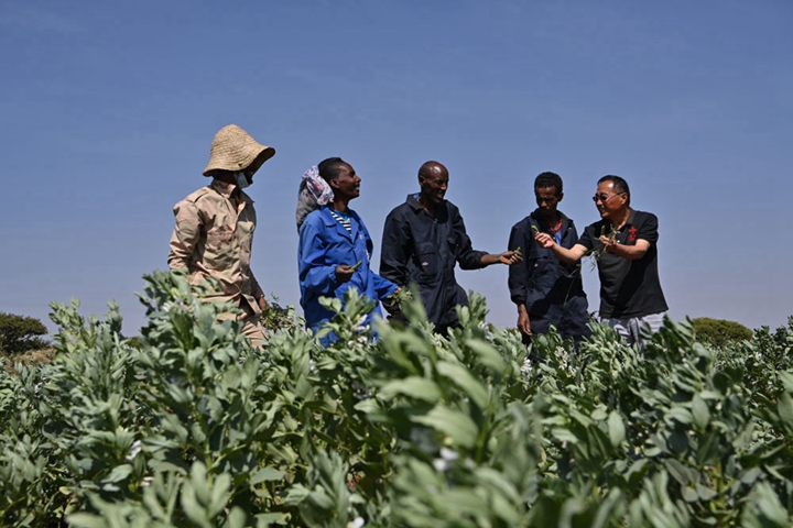 2023年9月27日,在位于厄立特里亚阿斯马拉的农业技术援助项目示范地,中国援厄第三期高级农业专家组豆类作物专家刘运民(右一)与当地农户交流。为推动厄立特里亚农业产业发展,中国农业农村部已派出多批专家在厄立特里亚开展涉及豆类作物、果树园艺、油料等领域的技术援助工作。