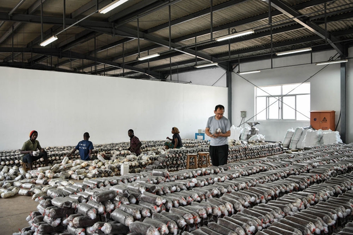 2024年8月13日,在卢旺达南方省胡耶区的中国援卢农业技术示范中心,菌草专家陈晓斌(右)检查菌袋。自菌草技术引入卢旺达以来,当地菌草产业发展迅速,不仅为市场提供了丰富的食用菌产品,还创造了大量就业机会。