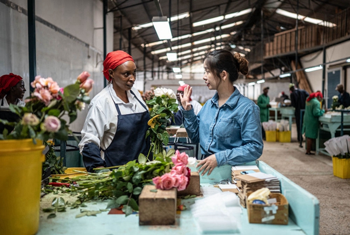 2024年5月18日,湖南玺悦国际贸易有限公司负责人黄梓楠(右)在肯尼亚纳纽基的坦布济花卉农场挑选鲜花。中国政府2021年11月宣布为非洲农产品输华建立“绿色通道”,缩短检验检疫时间,扩大关税豁免,为肯尼亚鲜花及非洲各国的牛油果、柑橘、菠萝等特色农产品打开了销路。