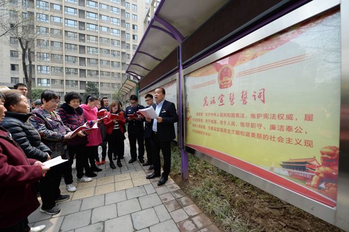 2018年3月20日,陕西宝伦律师事务所专职律师白银涛(右一)在西安华远君城社区宣传宪法知识。新华社记者 李一博 摄