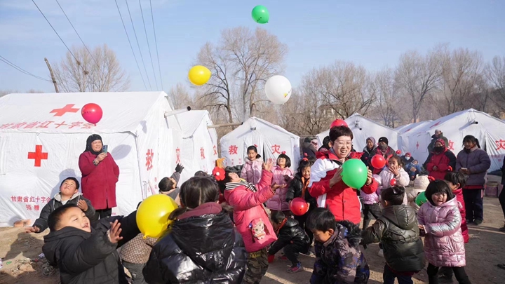 △2023年12月18日23时59分,甘肃临夏州积石山县发生6.2级地震。在红十字安置点,志愿者通过游戏、绘画等方式为孩子们提供心理辅导。